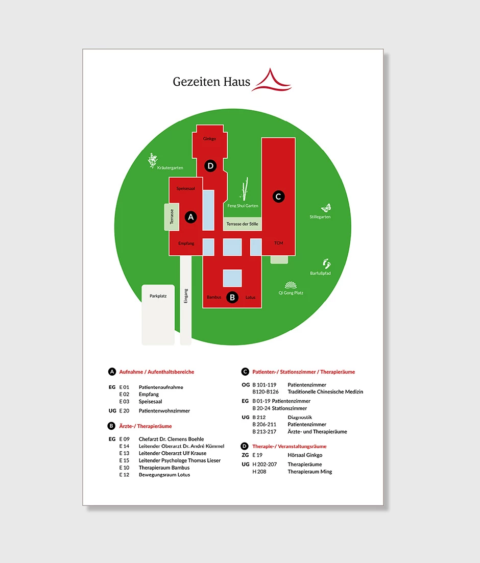 Wir modernisierten und vereinheitlichten den grafischen Auftritt. Das Logo wurde überarbeitet und ein umfassendes Gestaltungshandbuch entwickelt. Im Laufe der Zusammenarbeit von 4 Jahren sind Beschilderungssysteme, Flyer, Geschäftsausstattung, Broschüren, interne Kommunikationsmittel, Karten und Patientenmappen entstanden.